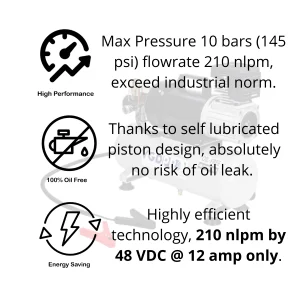 Our compressor delivers outstanding performance, reaching up to 10 bars (145 psi), making it capable of inflating virtually any type of tire, including truck wide tires. With a single piston, it achieves an impressive flow rate of 210 nlpm, far surpassing the typical 115 psi of regular gas station compressors. This versatility sets it apart from competitors, whose devices only reach 120 – 160 lpm. The reciprocating piston mechanism operates by moving the piston back and forth, drawing air into the cylinder. As the piston reaches its peak, it compresses the air and stores it in the gas tank, ensuring efficient compressed air production. Designed for horizontal placement, this compressor avoids issues related to cylinder lubrication and oil spills, providing reliable and hassle-free operation.