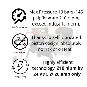 Our compressor delivers outstanding performance, reaching up to 10 bars (145 psi), making it capable of inflating virtually any type of tire, including truck wide tires. With a single piston, it achieves an impressive flow rate of 210 nlpm, far surpassing the typical 115 psi of regular gas station compressors. This versatility sets it apart from competitors, whose devices only reach 120 – 160 lpm. The reciprocating piston mechanism operates by moving the piston back and forth, drawing air into the cylinder. As the piston reaches its peak, it compresses the air and stores it in the gas tank, ensuring efficient compressed air production. Designed for horizontal placement, this compressor avoids issues related to cylinder lubrication and oil spills, providing reliable and hassle-free operation.
