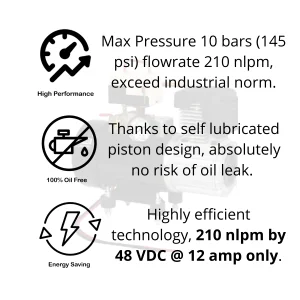 Our compressor delivers exceptional performance, reaching up to 10 bars (145 psi), making it capable of inflating virtually any type of tire, including wide truck tires, significantly surpassing the typical 115 psi of standard gas station compressors. With a single piston, it achieves an impressive flow rate of 210 nlpm, this versatility sets it apart from competitors, whose devices only reach 120 – 160 lpm. The reciprocating piston mechanism operates by moving the piston back and forth, drawing air into the cylinder. As the piston reaches its peak, it compresses the air and stores it in the gas tank, ensuring efficient compressed air production. Designed for horizontal placement, this compressor avoids issues related to cylinder lubrication and oil spills, providing reliable and hassle-free operation.