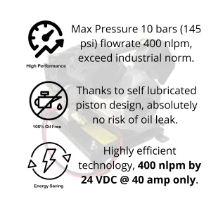 Our compressor delivers outstanding performance, reaching up to 10 bars (145 psi), making it capable of inflating virtually any type of tire, including truck wide tires. With a single piston, it achieves an impressive flow rate of 400 nlpm, far surpassing the typical 115 psi of regular gas station compressors. This versatility sets it apart from competitors, whose devices only reach 120 – 160 lpm. The reciprocating piston mechanism operates by moving the piston back and forth, drawing air into the cylinder. As the piston reaches its peak, it compresses the air and stores it in the gas tank, ensuring efficient compressed air production. This compressor avoids issues related to cylinder lubrication and oil spills, providing reliable and hassle-free operation.